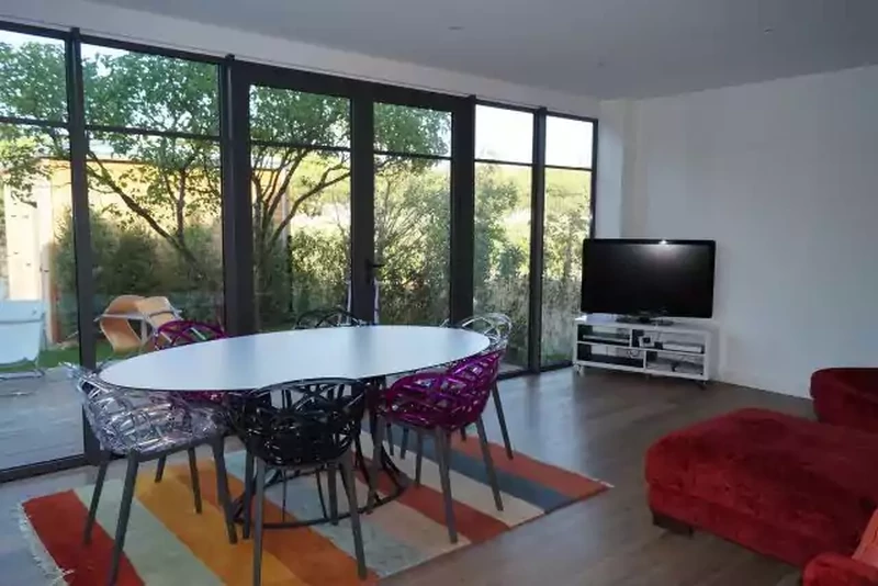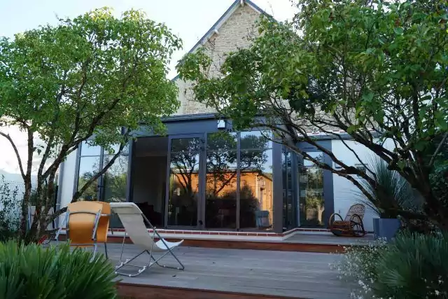 Réalisation d'une extension sur une villa de type balnéaire constituant une véritable pièce à vivre largement ouverte sur le jardin et se poursuit par des terrasses en bois qui annulent la frontière entre intérieur et extérieur.
