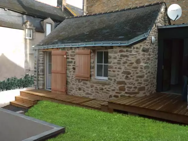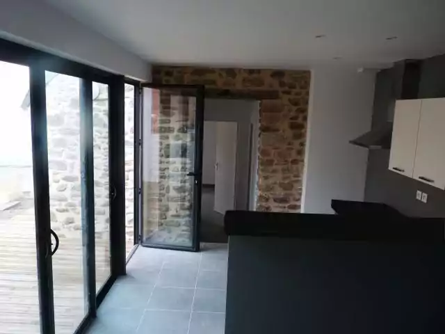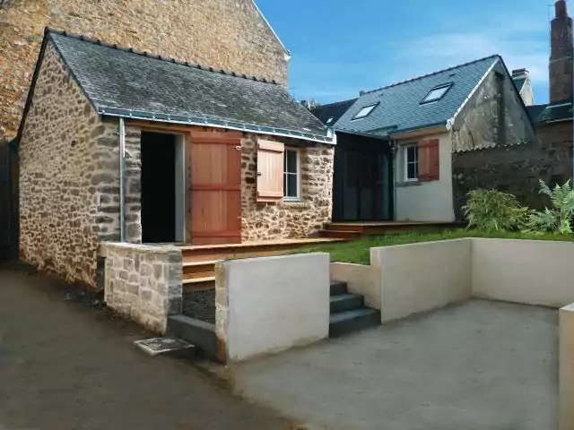 Le projet a consisté en la rénovation et l'extension de deux bâtiments construits dans le centre de Mesquer à la fin du XIXéme siècle; Il s'agissait à l'origine d'une forge et de la maison du forgeron. Ces bâtiments,en état d'origine, ne disposaient ni d'eau ni d'électricité et d'aucune commodité; les sols étaient en terre battue. Le projet devait permettre de disposer d'un logement individuel locatif comprenant un séjour cuisine, une chambre, sanitaires séparés et un espace sous comble. L'extension pratiquée entre les deux bâtiments a permis de les relier en formant une pièce de séjour orientée au Sud très lumineuse et ouverte sur une terrasse bois.